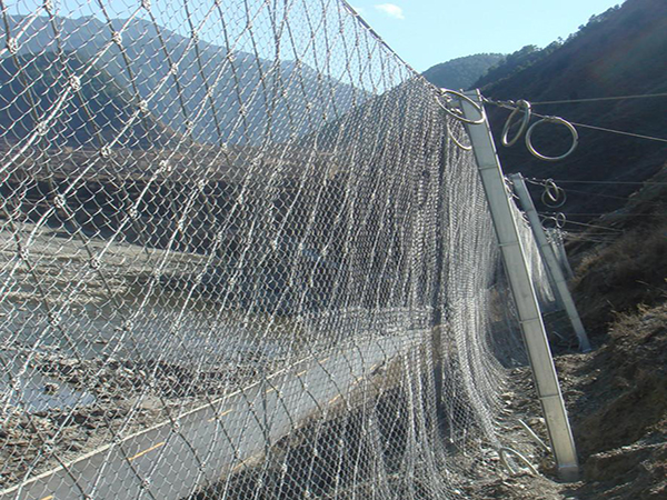鋼絲繩網(wǎng)是以高強(qiáng)度鋼絲繩柔性網(wǎng)(菱形鋼絲繩網(wǎng)、環(huán)形網(wǎng)、高強(qiáng)度鋼絲格 柵)作為主要構(gòu)成部分.并輔以錨桿、支撐繩等配件構(gòu)成整個系統(tǒng)。以覆蓋、緊固坡面的方式來防治坡面巖石崩塌、滾落、爆破飛石等危害。